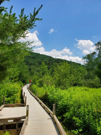 To get to the falls, walk on a boardwalk over a marshy area; upon entering the woods, on the left is an access point for the Appalachian Trail, and to the right, Thundering Falls, and the mill that was powered by the falls.
