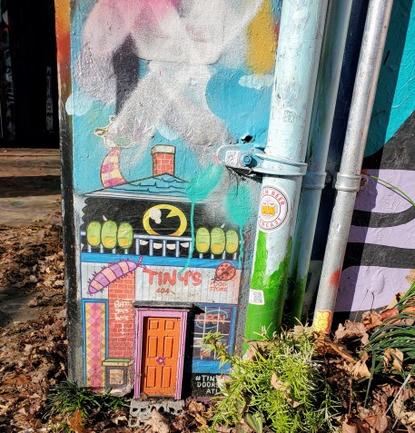 Singer only puts doors where they are requested – by the neighborhood or a specific business. Like fellow Atlanta artist YoYo Ferro, Singer understands the balance of art and business, and that while businesses can help fund the projects, it also allows the business to open their customers eyes to a world of art they may have never imagined. Commissioned doors include The Fox Theatre, The Georgia Aquarium, Draper James and The Swan House at The Atlanta History Center. Some people like to do the scavenger hunt and follow the map. Me? I love finding them “in the wild” and look forward to the Tiny Doors truck in the Pride Parade every year!