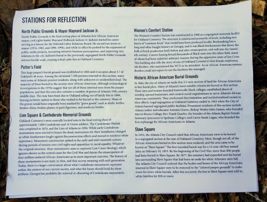 I learned so much about Atlanta’s famous black residents during various tours of Oakland Cemetery, including Juneteenth, the annual Halloween ghost tours, and Black History Month. Oakland is continuing its mission to preserve and restore its grounds and maintain the “homes” of its residents, and began restoration of the African-American grounds in 2017. Donations, involvement and sharing knowledge about their programs are always welcome!