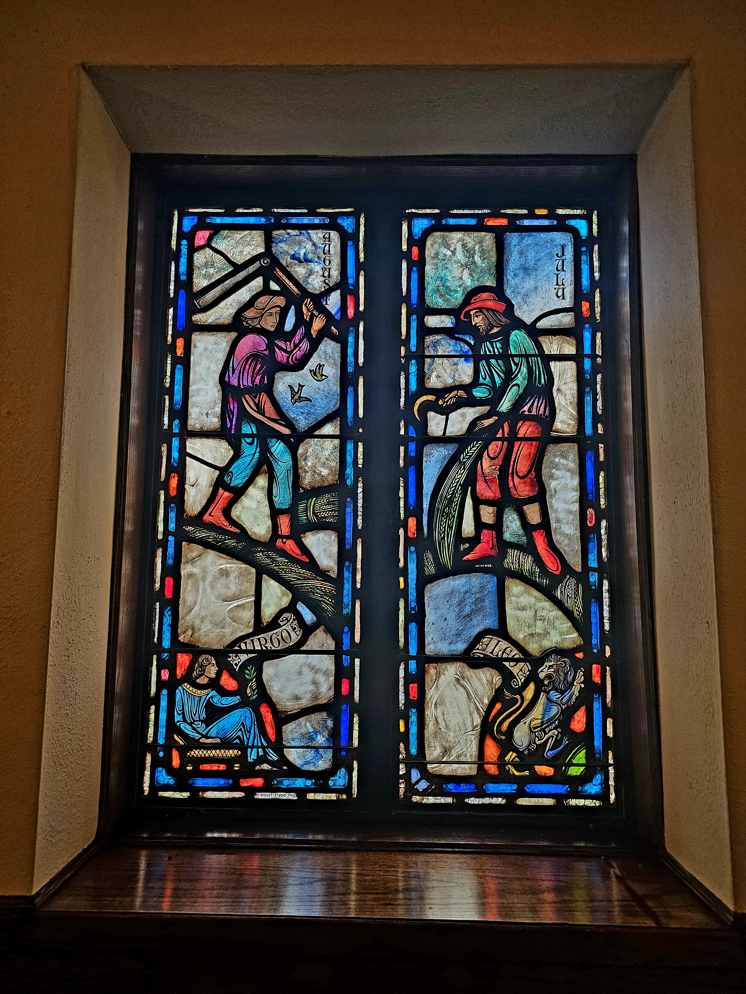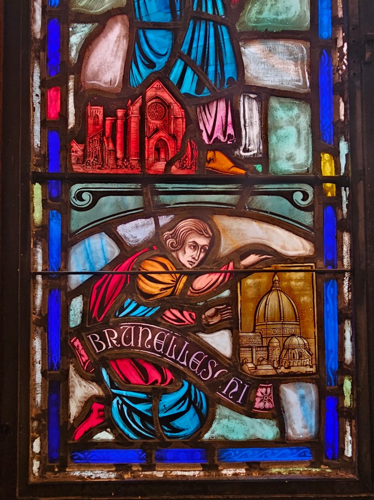 Stained glass designed by Henry Lee Willett of Philadelphia. The stained glass was hand-poured, hand-blown, hand-painted, and hand-cut.