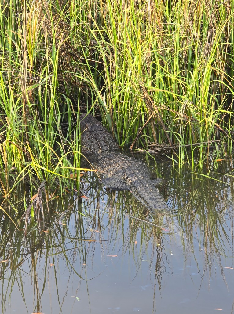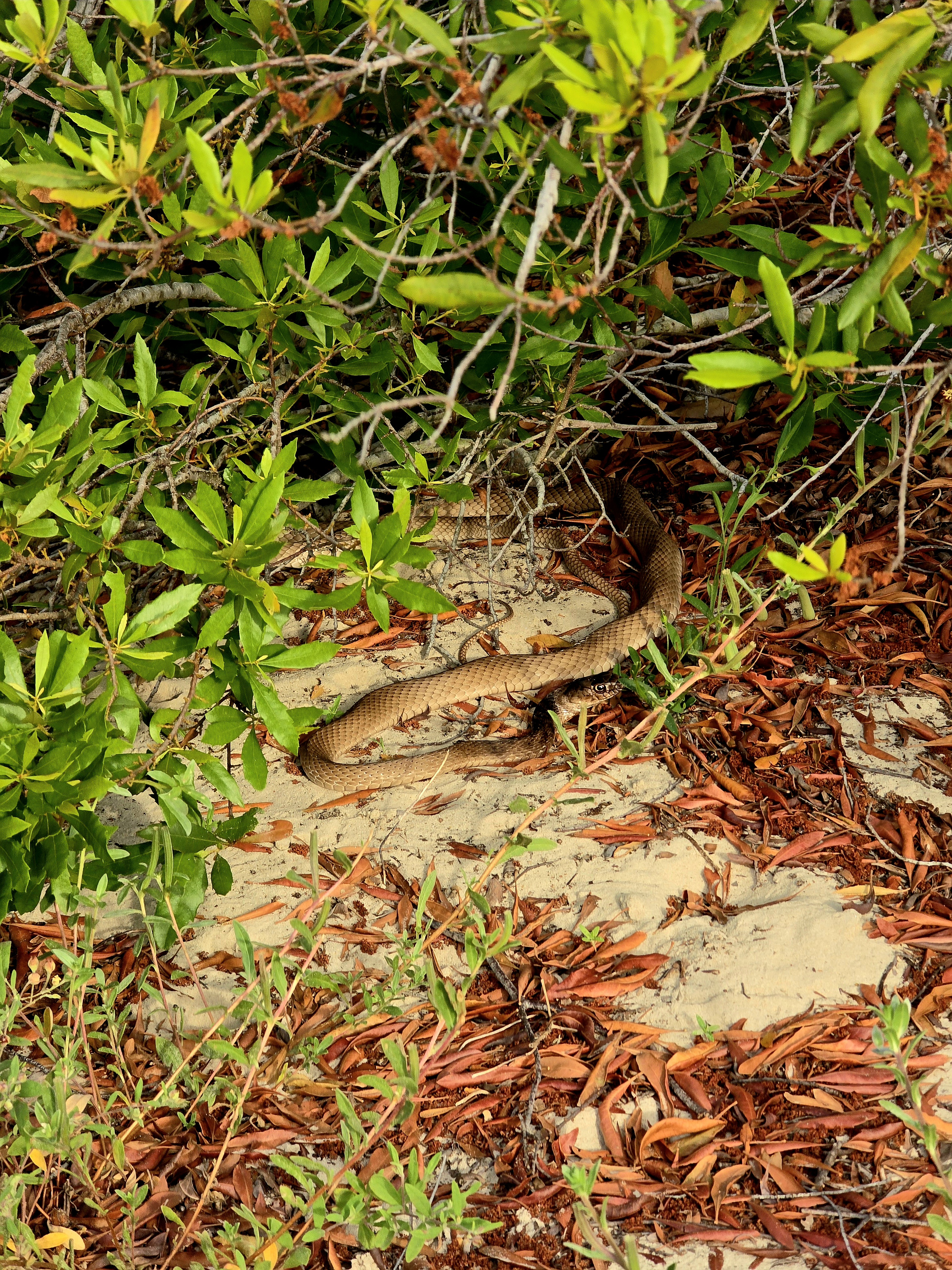 Thursday morning’s nature tour was mostly around the Dungeness ruins and the marsh just south of the ruins. Before we even left the drive in front of Greyfield, we saw a turkey, probably the same one we saw near the Dungeness outbuildings. While driving to the ruins, we saw several deer, who did not seem fazed at all by the sound of our truck or the sight of humans. We saw two baby great horned owls sitting on the metal supports holding up the Dungeness ruins, a red belly woodpecker on a dead palm tree, an alligator in the marsh, and a whip snake hiding in the grass on the beach. The only beings I didn’t appreciate were the gnats which had been attacking me relentlessly since I arrived Tuesday afternoon.