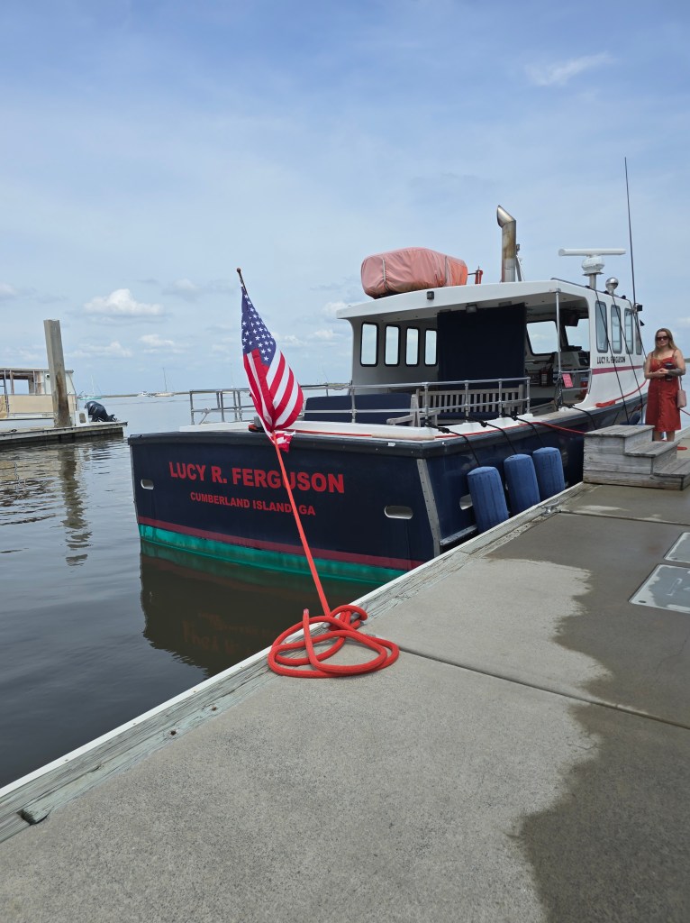 After I dropped Sirius off at the boarding facility on Amelia Island, I took the ferry from Amelia to Cumberland on the Lucy R. Ferguson, the ferry run by Greyfield Inn. Our ferry captain was Mitty Ferguson, great-great-grandson of Thomas Carnegie, and grandson of Lucy Ricketson Ferguson, who began Greyfield Inn in 1962. On the ferry, I met three women who would be staying in the same cottage as me. We hit it off right away as I discovered they all worked in museums, and we shared a love of history. We saw dolphins in Cumberland Sound, seemingly chasing the ferry as we headed north to Cumberland Island.