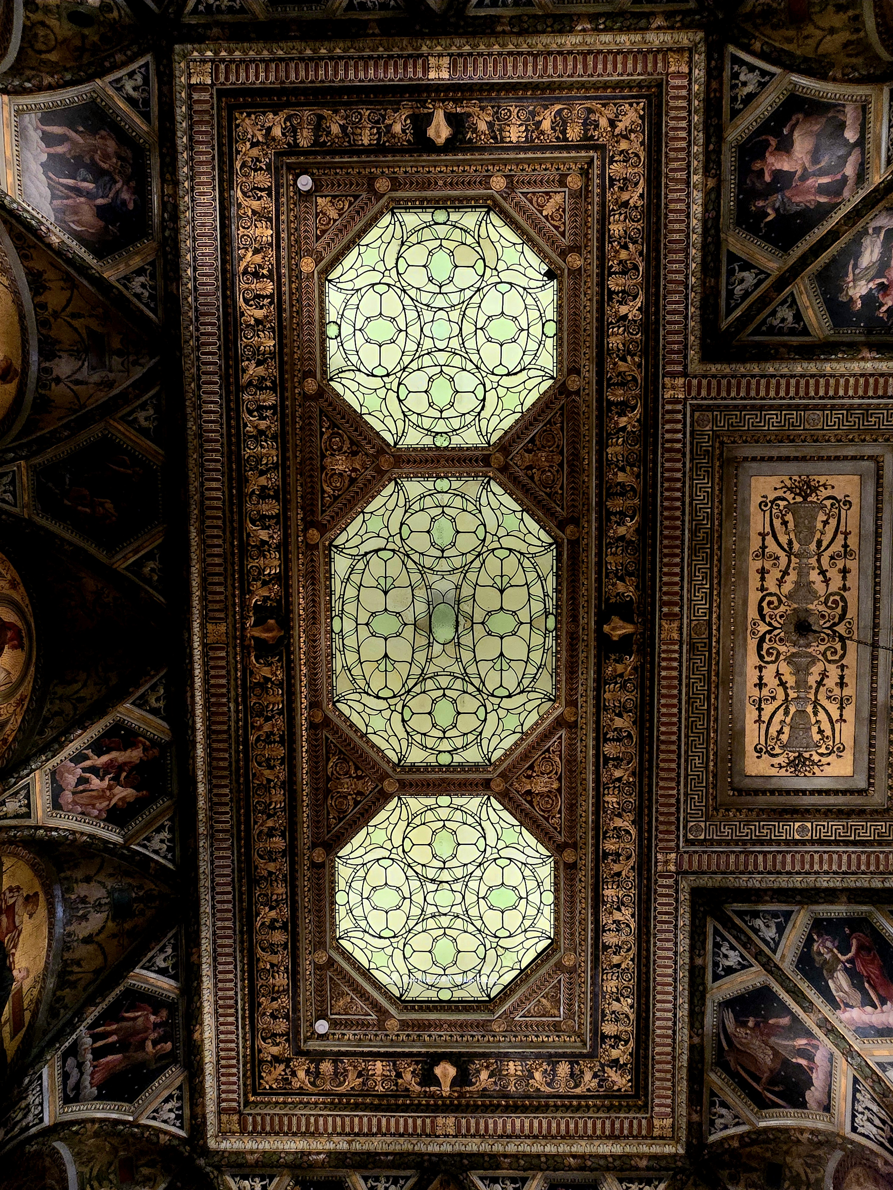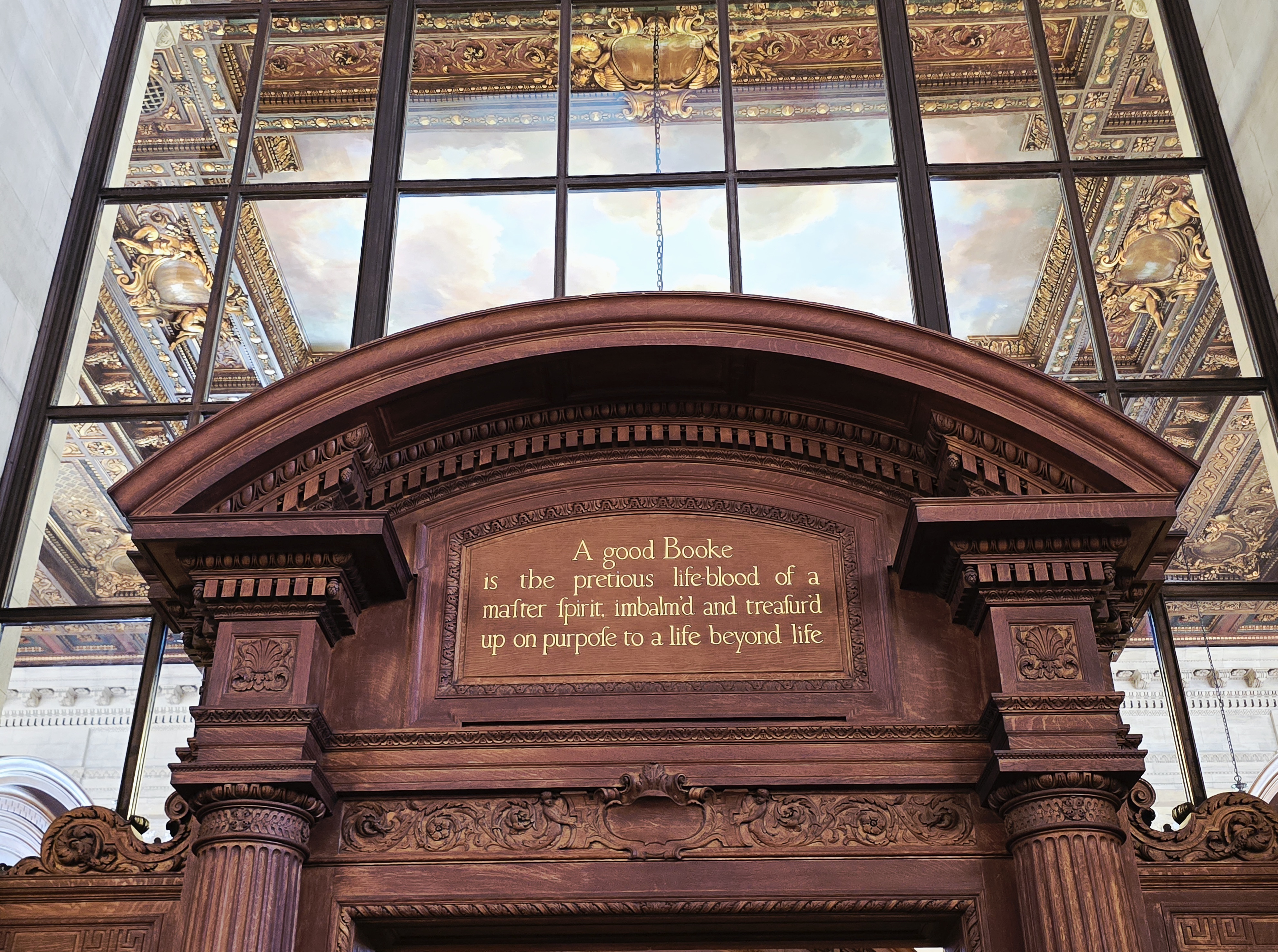 The Rotunda Room which serves as the main hallway before going into the public Catalog Room and the Rose Reading Room, is actually a rectangular room with a barrel-vault ceiling. The paintings by Edward Laning on the walls and the ceiling mural were commissioned by the WPA in the early 1940s. From the Rotunda Room, walk into the Public Catalog Room, which serves as an entry to the reading room, and gives you an idea of what the reading room would look like with its 50 foot ceilings, a ceiling mural, and identical chandeliers.