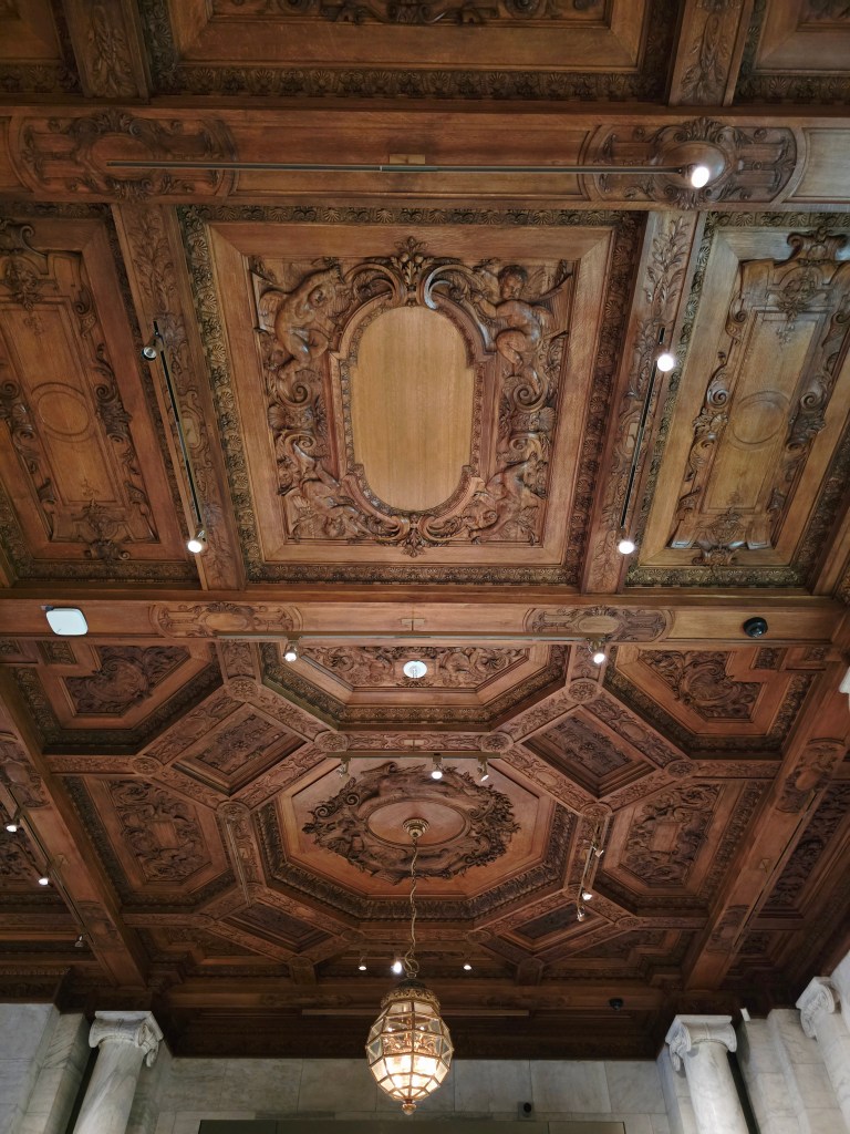 The Main Reading Room measures 77 feet wide by 295 feet long, with ceilings 50 feet high. When the library was built, the two rows of chandeliers in the reading room used incandescent light bulbs which were a recent innovation, and powered by the library’s own power plant. The plaster ceiling displays a reproduction 3-part mural since the original mural could not be salvaged during a 1998 restoration. The mural is surrounded by moldings of scroll cartouches, cherub heads, satyrs, nude female figures, flowers and vases of fruit, all of which disguise ventilation grills. The reading room went through a $12 million, two-year restoration, completed in 2016. The restoration was necessary after an ornamental rosette fell from the ceiling of the reading room.