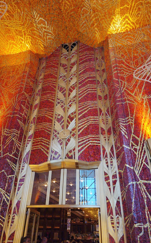I had walked by 1 Wall Street a few times during this trip, but didn’t think the fancy French store, Printemps, had anything for me. Tommy took the tour group inside and told us about the history of the building. The building was designed by Ralph Thomas Walker of Vorhees, Gmelin and Walker in the Art Deco style, and built between 1929 and 1931 for Irving Trust, an American bank. The exterior of the building was beautiful with its inverted Art Deco windows. We walked into the original lobby known as the Red Room, with brightly colored mosaics. Of course, the Red Room is now the shoe department for Printemps.Â