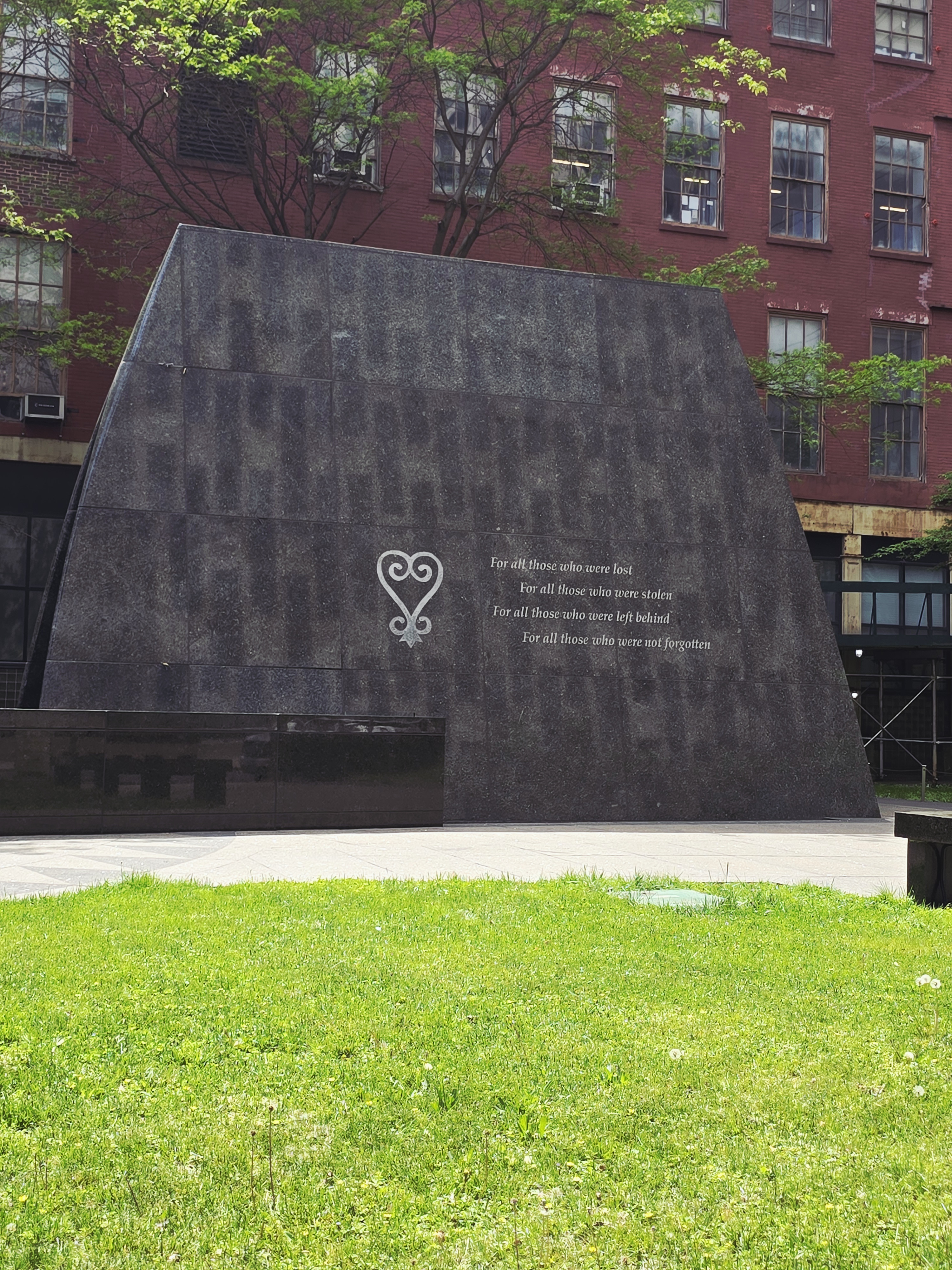Our last stop of the walking tour was the African Burial Ground National Monument. From the 1690s to 1794, somewhere around 15,000 enslaved and free Africans were buried here, both during Dutch, British and American rule. The remains were discovered during the construction of a federal building in the 1990s. The monument is hard to find because it’s surrounded by federal buildings, and it’s on a side street, so you have to walk around to find it, and it is very intimidating with road barriers set up everywhere. Appropriate, but this is where they they were buried, long before the federal buildings and most of these streets existed.