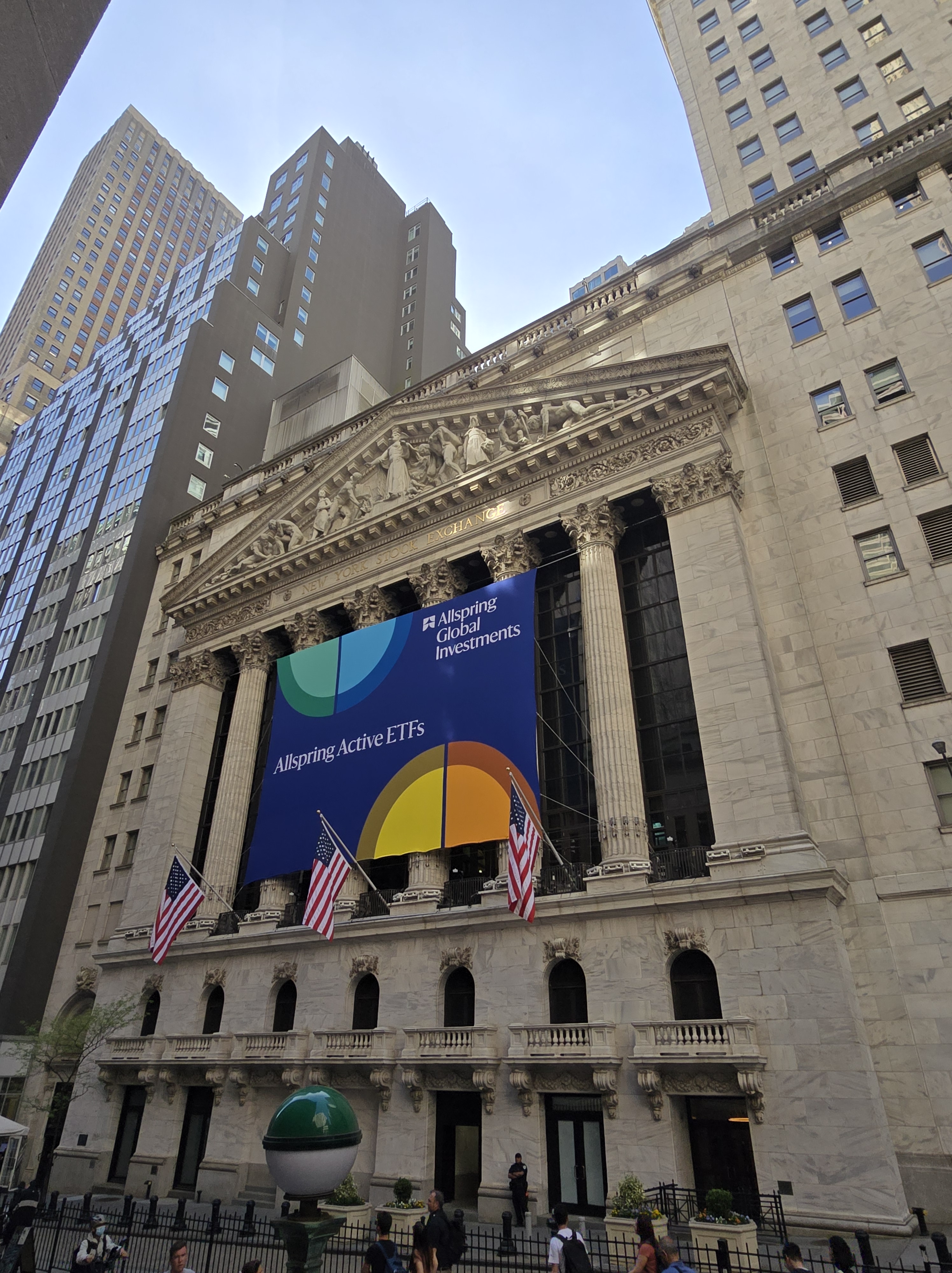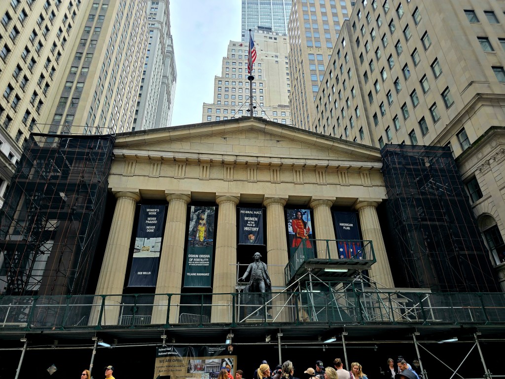 Next stop: We walked over Wall Street, with Federal Hall National Memorial and the New York Stock Exchange on either side, both Greek Revival Federal style buildings. While the NYSE itself was founded in 1792, the building we see on CNBC and Fox was built in 1903 in the Beaux Arts style and designed by George Post. It was designated a National Historic Landmark in 1978.