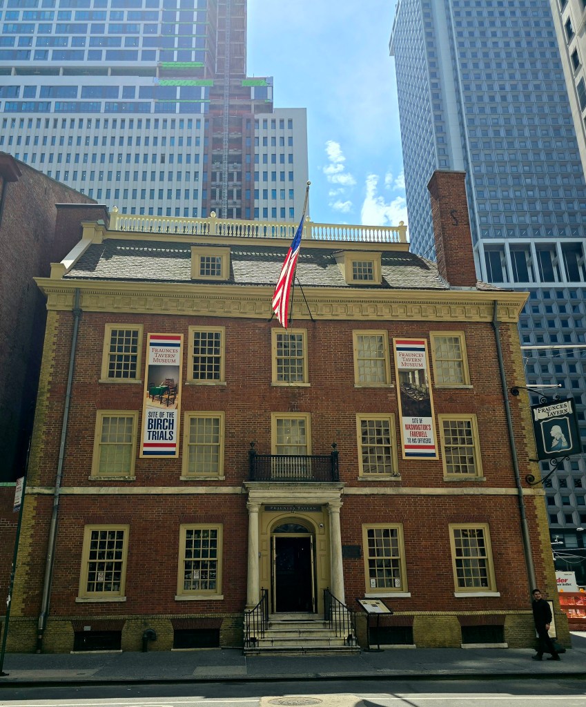 On Pearl Street, we stopped in front of Fraunces Tavern, supposedly the oldest continuously occupied building in Manhattan. Étienne “Stephen” DeLancey, son-in-law of Mayor Stephanus van Cortlandt, built the mansion in 1719. His family sold it to Samuel Fraunces in 1762, and it became The Queen’s Head, and taverns known by other names. The Sons of Liberty, and group of colonists who fought the British, met in the tavern throughout the Revolutionary War. They even had their own version of the Boston Tea Party, dumping tea into New York Harbor. The first Board of Governors meeting for what would become New York-Presbyterian Hospital was held at Fraunces Tavern on July 24, 1771. Then, after the British conceded defeat, George Washington delivered his farewell to the Continental Army officers on December 4, 1783. Quite a history for this building, and we haven’t even gotten to the 19th century.