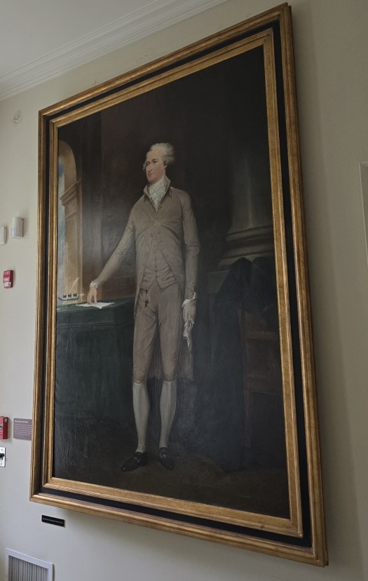 Federal Hall National Memorial isn’t open on weekends, but my hotel was only a few blocks away on the other side of Trinity Church, so I came over during my lunch break Thursday. The Greek Revival Federal style building on the site was designed by Alcander Jackson Davis and Ithiel Town and completed as the U.S. Customs House in 1842. It then housed the Subtreasury from 1862 to 1925. But before the current structure, another building stood on this site.